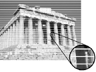 Horizontal ResolutionNow comes the trickier one: horizontal resolution. The arithmetic on this is a little deeper, so bear with me as we go through it. We think of our NTSC scheme as a 525-line, 29.97 frame per second, television system, that takes 1/15,734 of a second for each line to scan across the screen. Some of that scan line time is used to get the electron beam back from the right side of the screen over to the left again. This is called horizontal retrace, and it leaves us with a practical visible scan line that takes about 1/18975 of a second to track across the screen from left to right. (1) If we take our 4.2 MHz (4,200,000 cycles per second) of bandwidth that we're allowed at transmission, and divide it by the 1/18975 of a second that we have to display our video in (4,200,000 / 18975), we get about 220 cycles of signal per line. Yuck. Television pictures would look pretty chunky if you only were allowed a little more than 200 picture elements per line. But these are cycles, not pixels. Consider that a "cycle" is a positive going voltage followed by a negative going voltage - like in audio - and we represent video by a series of ever-changing voltages corresponding to the light level read by the camera. If we were to take our "bunch of black and white lines" chart and tip it so the lines were vertical, how many lines (black lines and white lines) would we see before we blurred? Each black line would be a low voltage, followed by each white line - a high voltage. That would be one "cycle." So with 220 cycles available to us, we could see 440 lines of video across the screen. That's more like it. To re-cap then, the practical resolution of our broadcast transmission environment is 340 lines top to bottom, and 440 lines left to right. (2) |