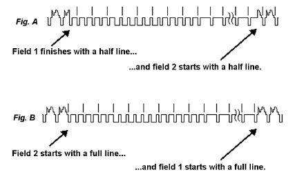 Up until now, we've been saying how television scans 525 lines in 1/30 of a second. Well, that's not exactly true. You see, it was true in the days of black and white television. But, to keep the visibility of the colour subcarrier in the monitor to a minimum (the "little dots" we referred to earlier), a couple of the specifications got changed.
