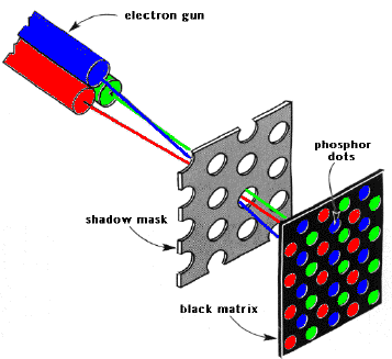 If you look at the screen of your colour TV set with a magnifying glass (turn it on, first), you can easily see the red, green, and blue phosphors at work. If you don't have a magnifying glass, try spraying the front of the screen with window cleaner (heck, your TV set screen probably needed cleaning anyway...)