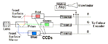 Colour CamerasThe three electrical signals that control the respective beams in the picture tube are, these days, produced in the colour television camera by three CCD (Charge Coupled Device) integrated circuit chips. The camera has a single lens, behind which a set of prisms or special dichroic mirrors produce three images of the scene. These are focused on the three CCDs. In front of each one is a colour filter; the filters pass respectively only the red, green, or blue components of the light in the scene to the chips. The three signals produced by the camera are transmitted to the respective electron guns in the picture tube, where they re-create the scene. |