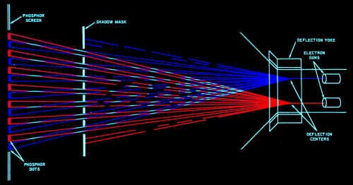 Because the coloured dots are so small that they cannot be seen separately by the viewer, the effect is three superimposed images in the primary colours. By adjusting the strength of the respective beams of electrons, the relative brightness of the image produced by each can be changed.